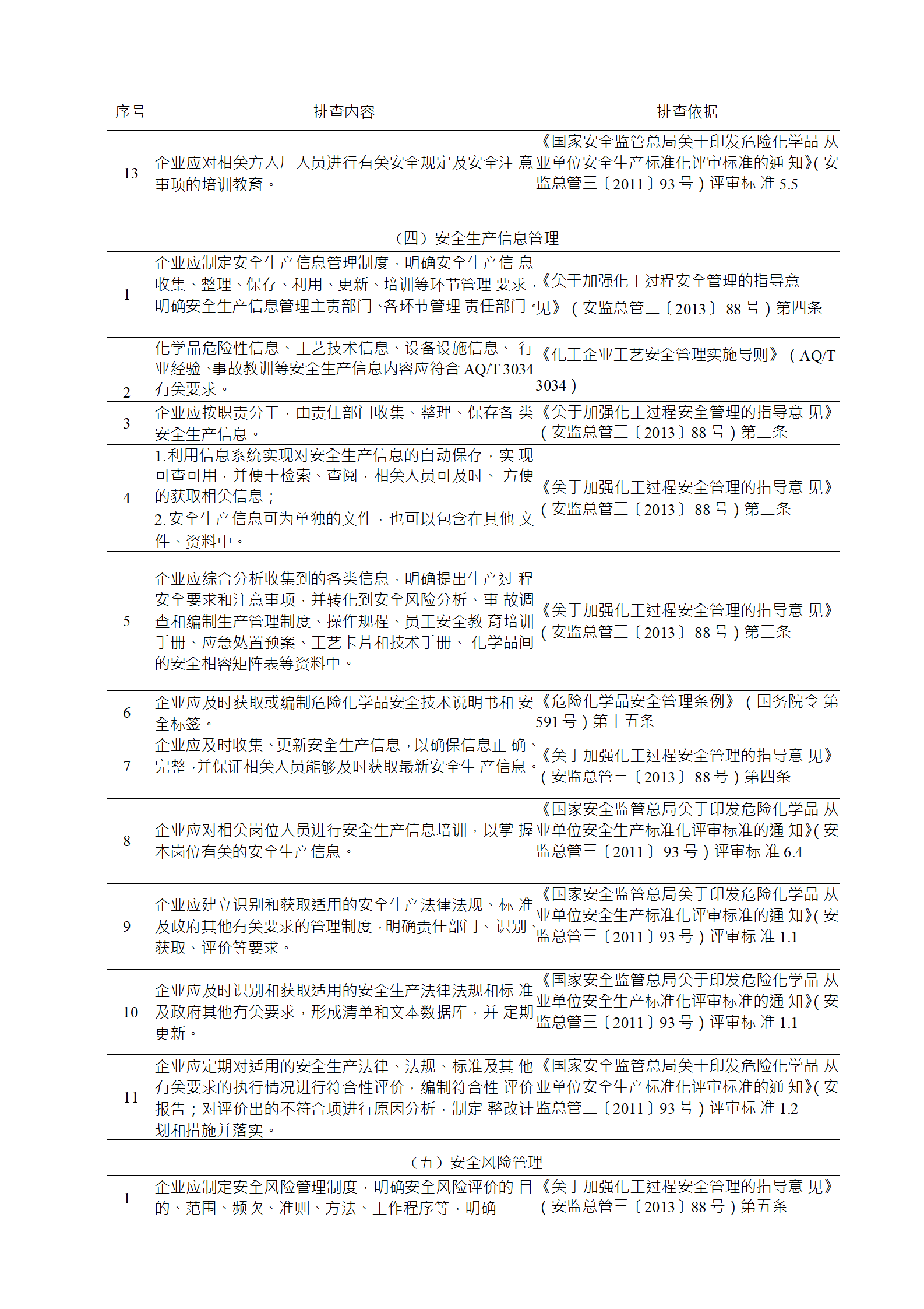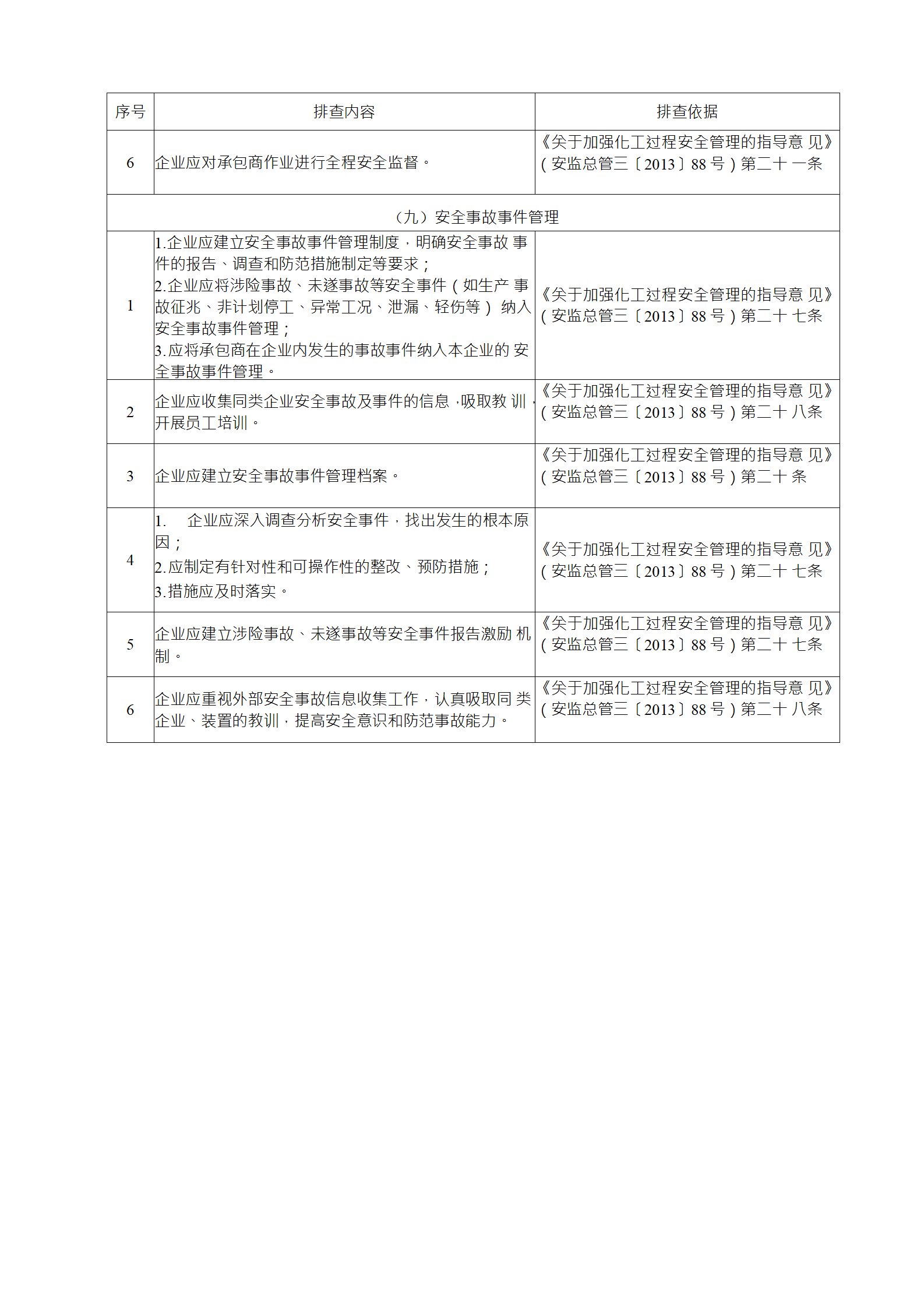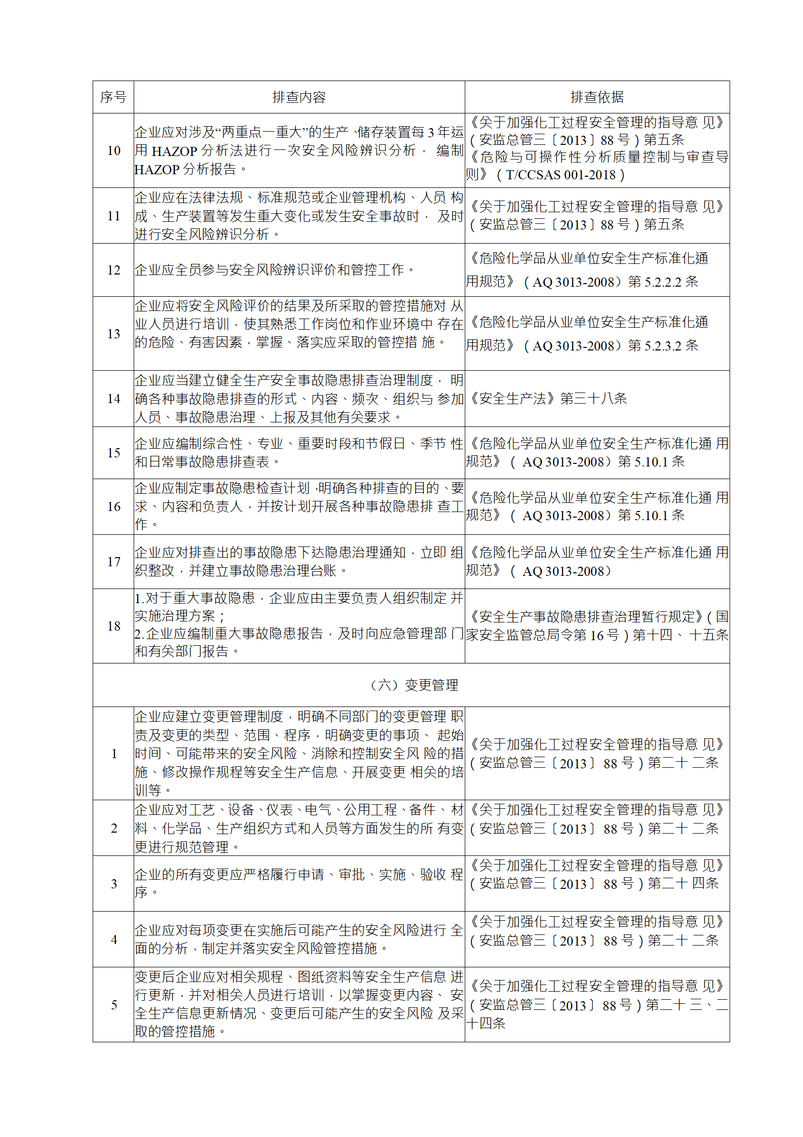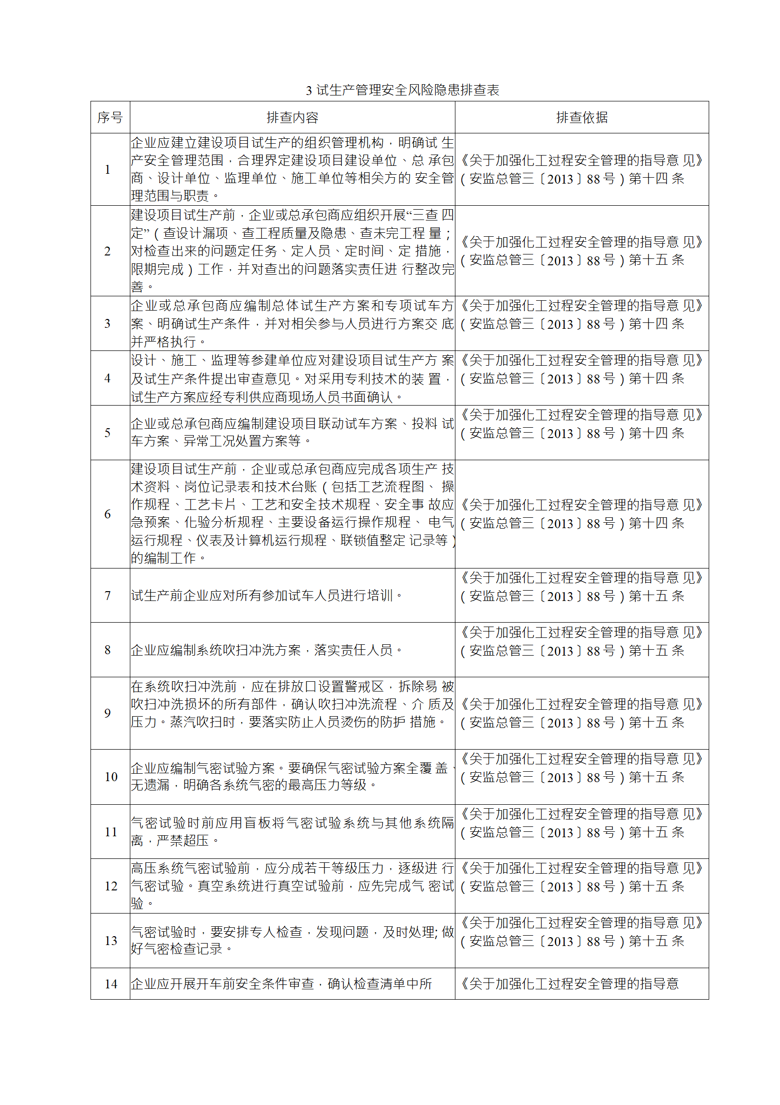 企業(yè)應結(jié)合自身安全風險及管控水平,按照化工過程安全 管理的要求,參照各專業(yè)安全風險隱患排查表(見附件),編制 符合自身實際的安全風險隱患排查表,開展安全風險隱患排查 工作。
