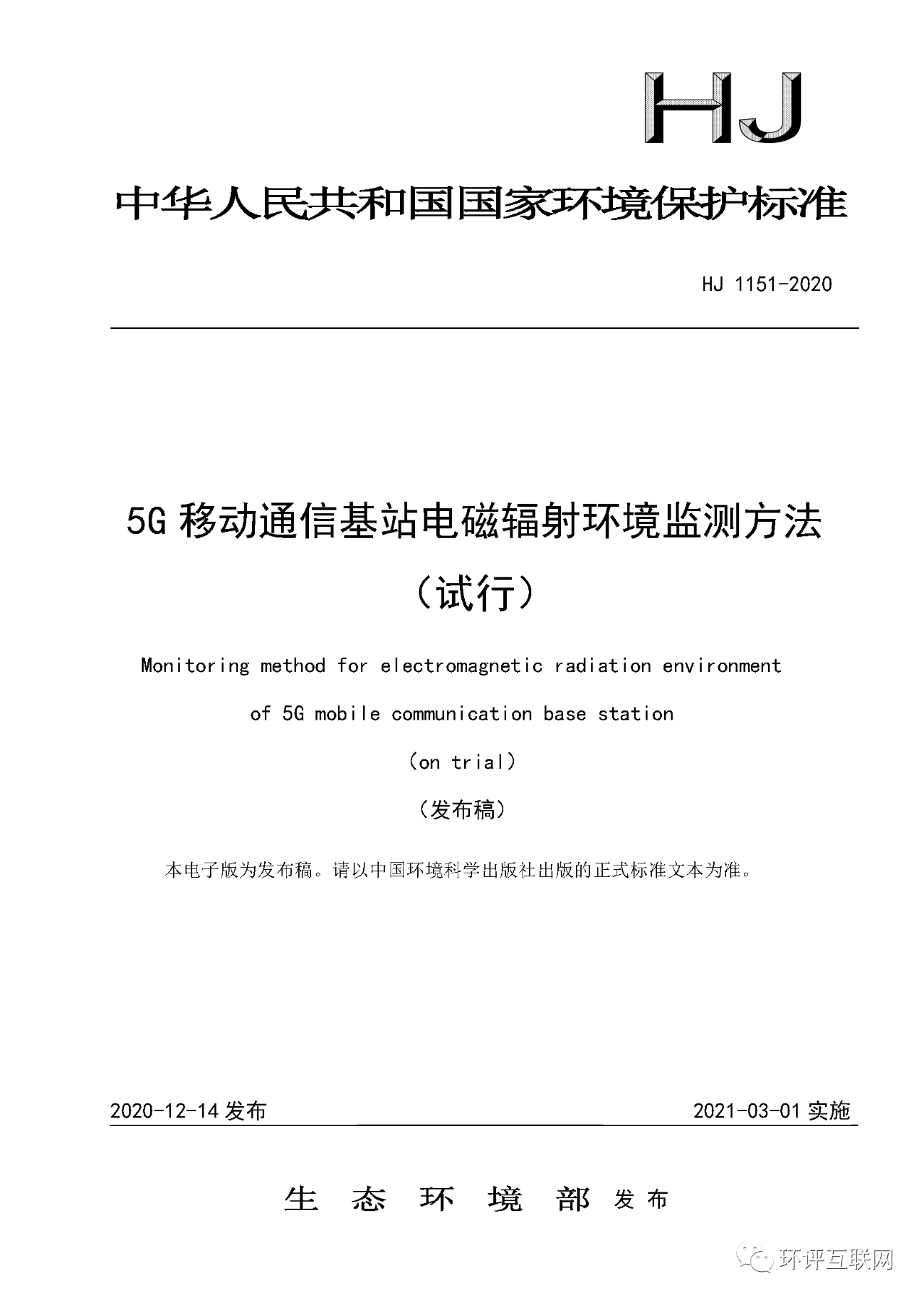 關(guān)于發(fā)布《5G移動通信基站電磁輻射環(huán)境監(jiān)測方法(試行)》等四項國家環(huán)境保護標準的公告