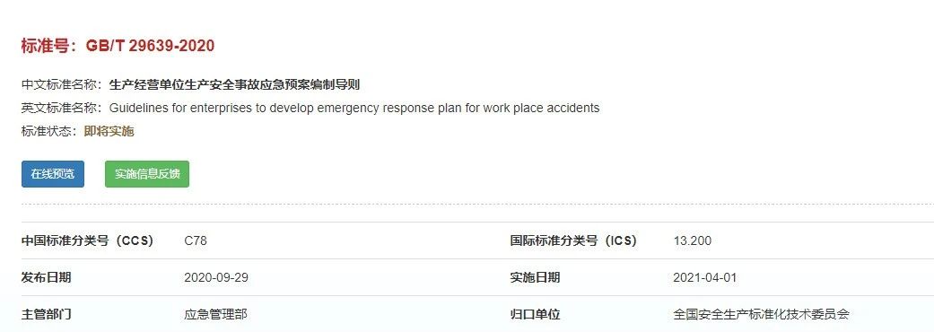 重磅!GBT29639-2020《生產(chǎn)經(jīng)營單位生產(chǎn)安全事故應(yīng)急預(yù)案編制導(dǎo)則》發(fā)布,21年4月實(shí)施!