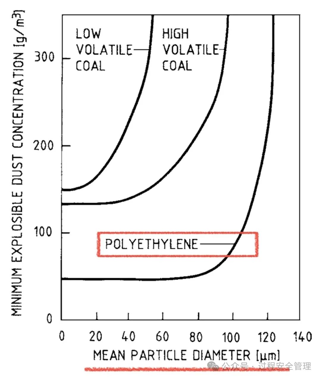 聚乙烯粉塵的粒徑小于90μm的情況下,最低爆炸濃度(MEC)大致為33g/m3,聚乙烯粉塵的粒徑大于120μm時,最低爆炸濃度(MEC)急劇升高,粉塵爆炸的可能性大幅降低。如果聚乙烯粉塵云濃度大于30g/m3,存在極大的粉塵爆炸風險。