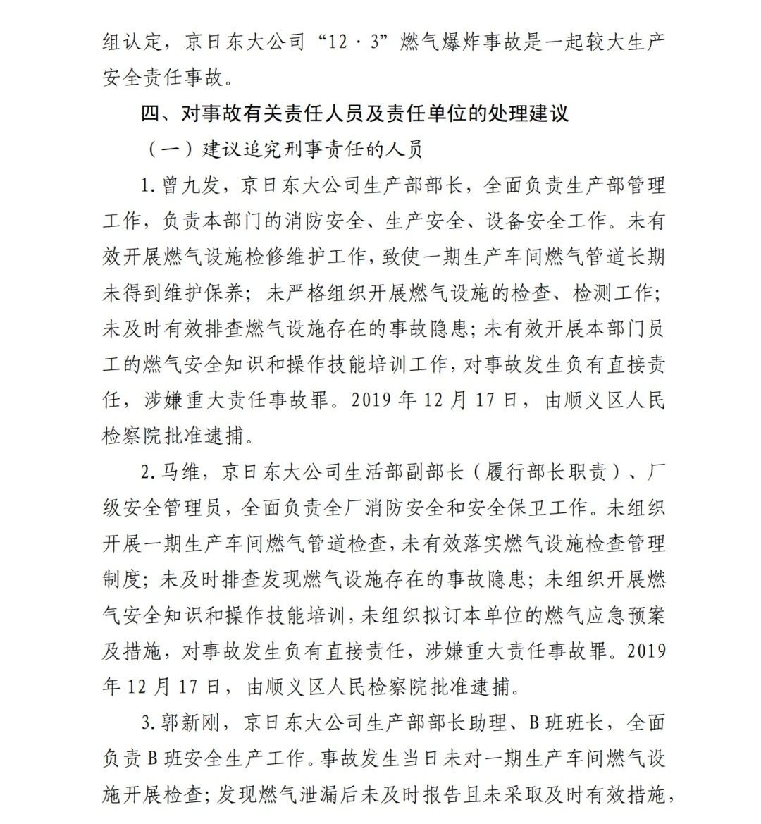 2.馬維,京日東大公司生活部副部長(履行部長職責(zé))、廠級安全管理員,全面負(fù)責(zé)全廠消防安全和安全保衛(wèi)工作。未組織開展一期生產(chǎn)車間燃?xì)夤艿罊z查,未有效落實(shí)燃?xì)庠O(shè)施檢查管理制度;未及時(shí)排查發(fā)現(xiàn)燃?xì)庠O(shè)施存在的事故隱患;未組織開展燃?xì)獍踩R和操作技能培訓(xùn),未組織擬訂本單位的燃?xì)鈶?yīng)急預(yù)案及措施,對事故發(fā)生負(fù)有直接責(zé)任,涉嫌重大責(zé)任事故罪。2019 年 12 月 17 日,由順義區(qū)人民檢察院批準(zhǔn)逮捕。