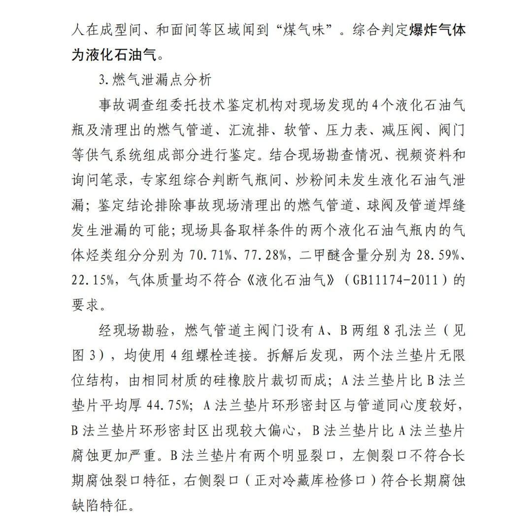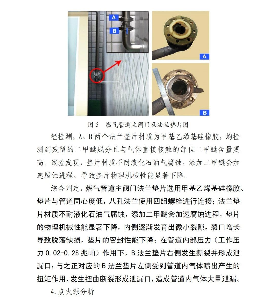 本次事故的直接原因?yàn)椋?/span>京日東大公司一期生產(chǎn)車間燃?xì)夤艿乐鏖y門A、B法蘭墊片為甲基乙烯基硅橡膠材質(zhì),受管道內(nèi)液化石油氣和二甲醚混合氣體長期腐蝕,墊片物理機(jī)械性能下降,發(fā)育出微小裂隙并逐漸增長,局部發(fā)生破損脫落;在管道內(nèi)部壓力作用下,B墊片發(fā)生撕裂并形成泄漏口,泄漏出的氣體與空氣混合,在冷藏庫內(nèi)外空間形成爆炸性混合氣體,遇電氣火花等點(diǎn)火源發(fā)生爆炸,并引燃現(xiàn)場可燃物,導(dǎo)致事故發(fā)生。