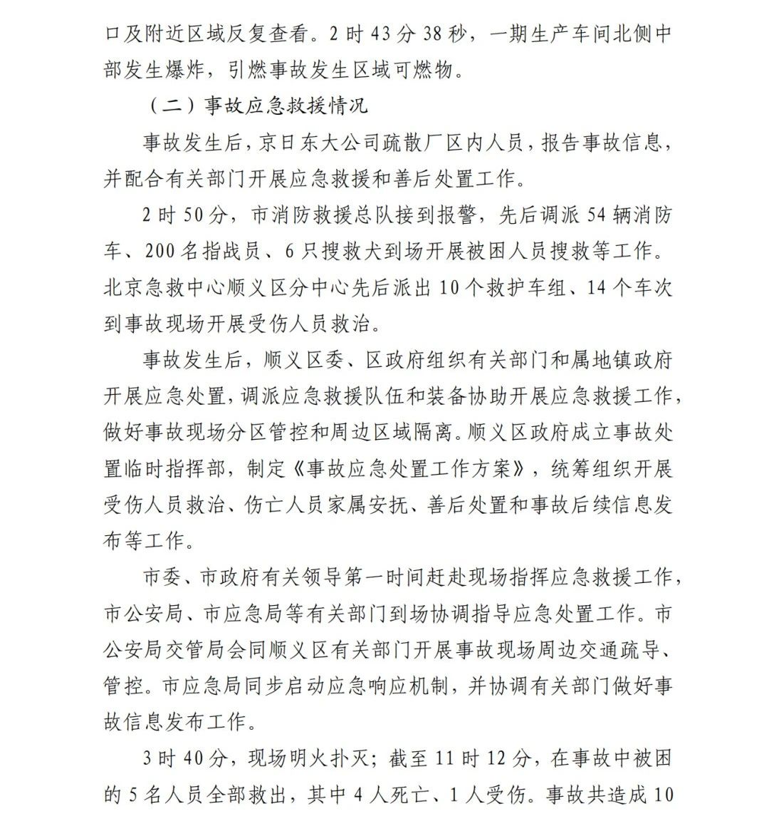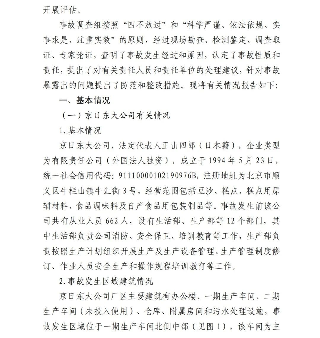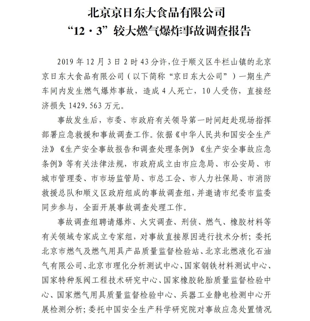 2019年12月3日2時(shí)43分許,北京順義區(qū)牛欄山鎮(zhèn)的(以下簡稱“京日東大公司”)一期生產(chǎn)車間內(nèi)發(fā)生燃?xì)獗ㄊ鹿?,造?人死亡,10人受傷,直接經(jīng)濟(jì)損失1429.563萬元。