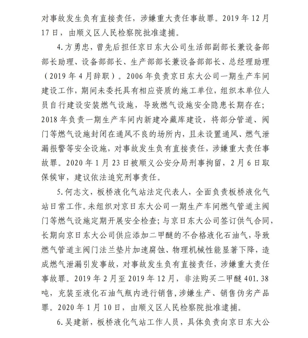 5.何志文,板橋液化氣站法定代表人,全面負(fù)責(zé)板橋液化氣站日常工作。未組織對京日東大公司一期生產(chǎn)車間燃?xì)夤艿乐鏖y門等燃?xì)庠O(shè)施定期開展安全檢查;與京日東大公司簽訂供氣合同,長期向京日東大公司供應(yīng)添加二甲醚的不合格液化石油氣,導(dǎo)致燃?xì)夤艿乐鏖y門法蘭墊片加速腐蝕、物理機(jī)械性能顯著下降,造 成燃?xì)庑孤┮l(fā)事故,對事故發(fā)生負(fù)有直接責(zé)任,涉嫌重大責(zé)任事故罪。2019 年 2 月至 2019 年 12 月,非法購買二甲醚 401.38 噸,充裝至液化石油氣瓶內(nèi)進(jìn)行銷售,涉嫌生產(chǎn)、銷售偽劣產(chǎn)品 罪。2020 年 1 月 10 日,由順義區(qū)人民檢察院批準(zhǔn)逮捕。