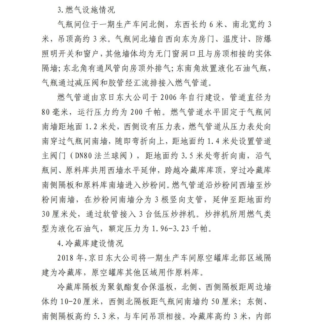 事故調(diào)查報(bào)告顯示:方勇忠2006年負(fù)責(zé)京日東大公司一期生產(chǎn)車間建設(shè)工作,期間未委托具有相應(yīng)資質(zhì)的施工單位,而組織本單位人員自行建設(shè)安裝燃?xì)庠O(shè)施,導(dǎo)致燃?xì)庠O(shè)施安全隱患長期存在。另外,方勇忠2018年負(fù)責(zé)一期生產(chǎn)車間內(nèi)新建冷藏庫建設(shè),將部分管道、閥門等燃?xì)庠O(shè)施封閉在通風(fēng)不良的場所內(nèi),且未設(shè)置通風(fēng)、燃?xì)庑孤﹫?bào)警等安全設(shè)施,因而對事故發(fā)生負(fù)有直接責(zé)任。