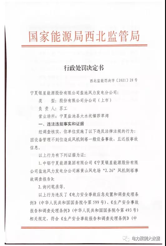 近日,國家能源局西北監(jiān)管局發(fā)布【2021】28號行政處罰決定書,因設備管理不到位造成風機倒塔一般設備事故,且遲報事故信息,對寧夏銀星能源股份有限公司鹽池風力發(fā)電分公司罰款10萬元。