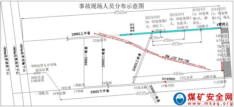 根據(jù)現(xiàn)場勘查和搶險(xiǎn)救援報(bào)告認(rèn)定:事故地點(diǎn)位于-810m 水平二采區(qū)南翼 2305S 工作面上平巷及三聯(lián)巷。