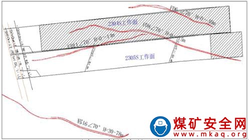 FD6 斷層:位于 2019 年已推采完畢的 2304S 工作面北部,正斷層,落差 0~10m,傾角 70°,傾向 SE,走向 NE,斷層在2304S 工作面延展長度 400m。