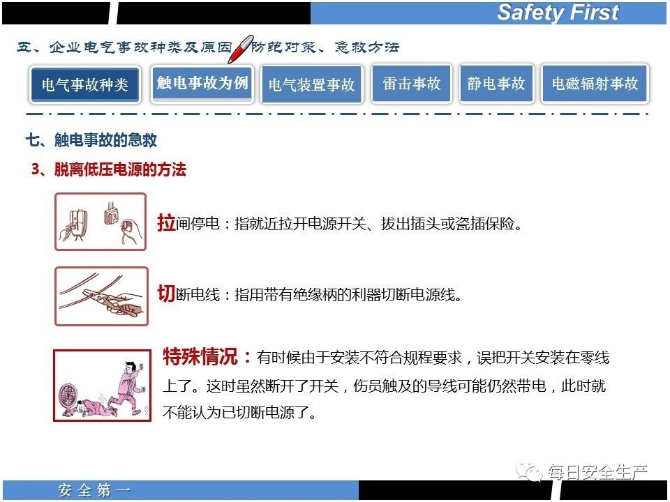 如果是低壓電源觸電,實施“五字”脫離電源法: