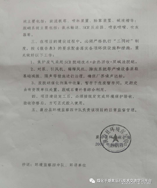 1)濕法脫硫系統(tǒng)由青島博利爾電力環(huán)保設(shè)備有限公司設(shè)計(jì)、施工,建設(shè)時(shí)間為2015年6月。2)脫硝系統(tǒng)由山西長(zhǎng)林能源科技有限公司設(shè)計(jì)、施工,建設(shè)時(shí)間為2017年5月。3)半干法脫硫系統(tǒng)由北京晨曦環(huán)保有限公司設(shè)計(jì)、施工,建設(shè)時(shí)間為2018年6月。原襄汾縣環(huán)境保護(hù)局2018年6月7日出具了《關(guān)于山西省襄汾縣宏源煤焦化工有限公司一車(chē)間、二車(chē)間焦化項(xiàng)目焦?fàn)t尾氣脫硫、脫硝綜合改造工程建設(shè)項(xiàng)目環(huán)境影響報(bào)告表的審批意見(jiàn)》(襄環(huán)審函〔2018〕56號(hào))。4)宏源煤焦化工有限公司一車(chē)間、二車(chē)間焦化項(xiàng)目焦?fàn)t尾氣脫硫、脫硝綜合改造工程工藝簡(jiǎn)介:本項(xiàng)目采用的是先脫硝后脫硫工藝,脫硝系統(tǒng)為中低溫SCR脫硝工藝,脫硝效率86%,一爐配一套SCR反應(yīng)器,氨水來(lái)自于焦化廠(chǎng)區(qū)內(nèi)氨水管網(wǎng),焦?fàn)t煙氣脫硫系統(tǒng)采用雙堿法脫硫工藝,脫硫效率為80%,具體設(shè)備設(shè)施包括:中低溫SCR脫硝裝置、余熱回收裝置、濕電除塵裝置等。