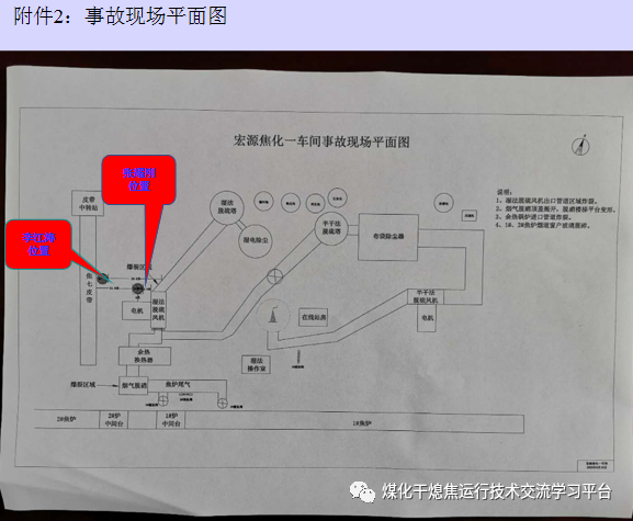 宏源煤焦化工有限公司一車(chē)間由于焦?fàn)t煙道氣半干法脫硫系統(tǒng)除塵布袋堵塞無(wú)法正常運(yùn)行,于9月1日白班停止半干法脫硫系統(tǒng),啟動(dòng)濕法脫硫系統(tǒng)運(yùn)行,處理后的煙道氣由于含水量大,溫度較低不能進(jìn)入焦?fàn)t煙道大煙囪,改由濕法脫硫系統(tǒng)煙囪排放。9月8日8時(shí)54分左右引風(fēng)機(jī)停車(chē),由于焦?fàn)t煙道氣脫硫脫硝控制室人員董副紅在現(xiàn)場(chǎng)巡檢,造成控制室無(wú)人值守,未能及時(shí)發(fā)現(xiàn),從而未及時(shí)采取應(yīng)急處置措施,也未通知焦?fàn)t主控室人員采取應(yīng)急處置措施,而焦?fàn)t9時(shí)仍正常進(jìn)行交換,交換完成時(shí)間大約為47秒,交換作業(yè)完畢后焦?fàn)t主控室人員發(fā)現(xiàn)煙道吸力降至20Pa左右,隨即采取了停止加熱措施;9時(shí)04分左右在工段長(zhǎng)張耀剛指揮下董副紅重新啟動(dòng)引風(fēng)機(jī),9時(shí)06分左右發(fā)生爆炸, 9時(shí)22分左右焦?fàn)t煙道氣脫硝系統(tǒng)發(fā)生爆炸。