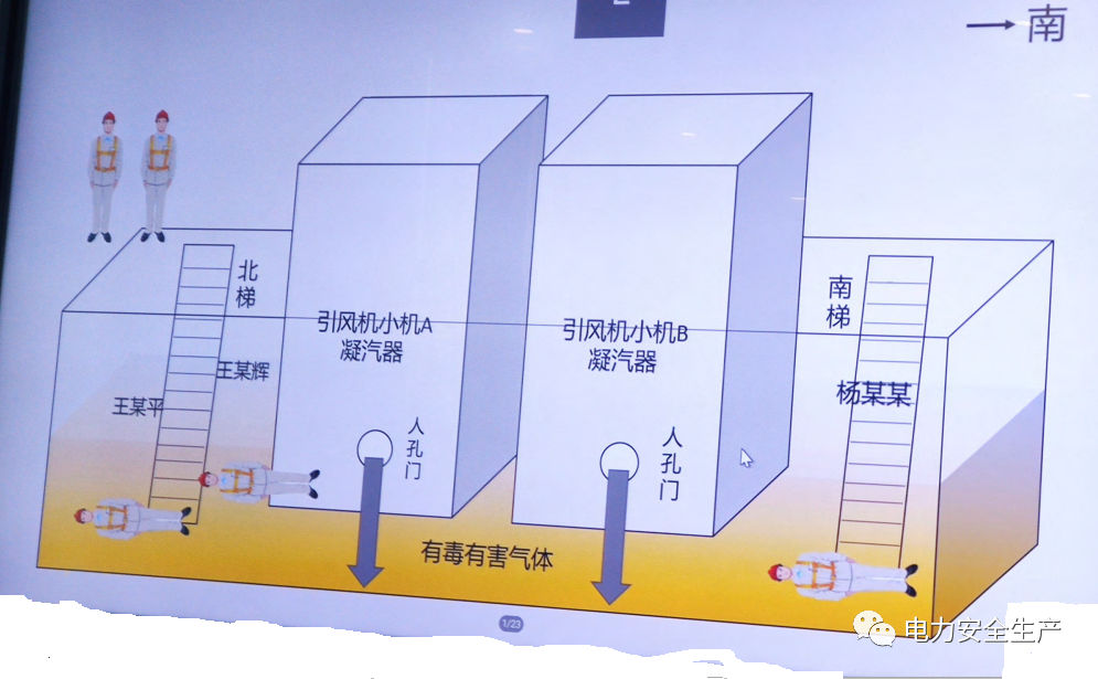 15:40安潔公司楊某某等4名作業(yè)人員,從#4機組汽動引風(fēng)機室北側(cè)鋼步梯依次走下凝汽器區(qū)域準(zhǔn)備清理垃圾及取回相關(guān)工具,走在前面的王某某、王某某在下樓梯半途中暈倒并滑落至樓梯底部,走在后面的楊某某、王某某發(fā)現(xiàn)情況異常,隨即退至汽動引風(fēng)機室外,并電話報告檢修部鄭某某。