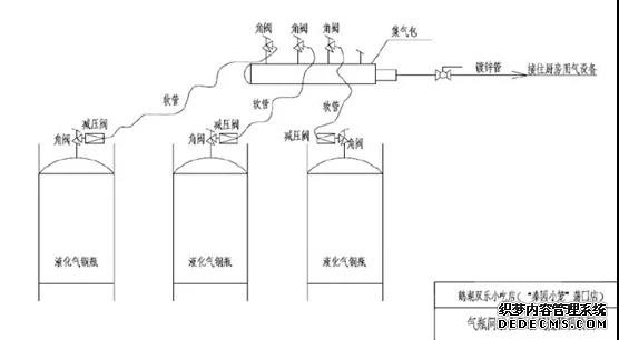 氣瓶間南北向?qū)?.5米,東西向長6米。沿北墻由西向東依次放置冰箱一臺(tái)、50Kg空瓶5只(編號(hào)為1#、2#、3#、4#、8#);沿南墻由西向東依次設(shè)置油水分離器一套、冰箱一臺(tái)、50Kg液化石油氣鋼瓶3只(編號(hào)由南向北依次9#、6#、7#)。9#、6#、7#鋼瓶中的液化石油氣通過調(diào)壓閥、燃?xì)庀鹉z軟管連接至集氣包,由集氣包向二樓廚房間送氣。
