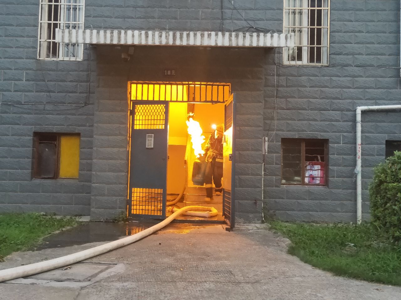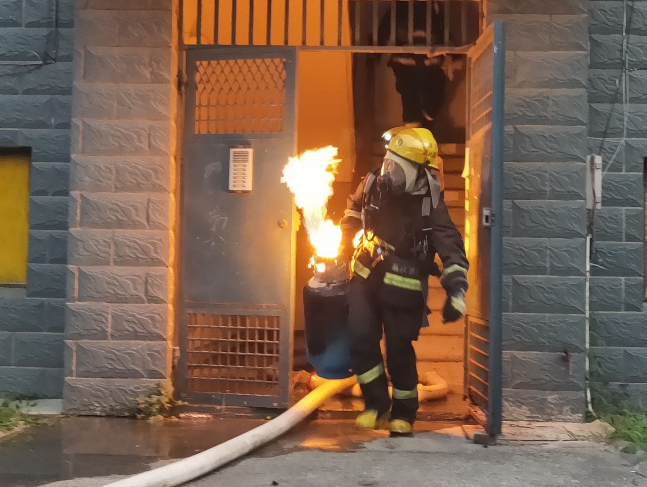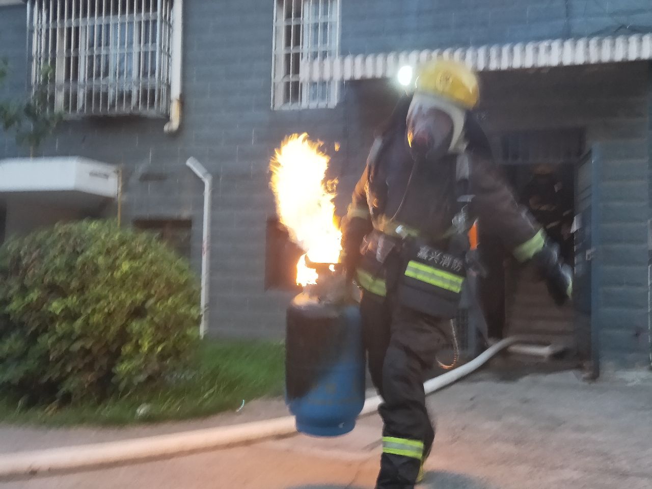 到達(dá)現(xiàn)場(chǎng)消防指戰(zhàn)員發(fā)現(xiàn),著火處物為煤氣罐,該煤氣罐位于居民房?jī)?nèi)廚房里,處于猛烈燃燒階段,隨時(shí)都有爆炸的可能,而且居民樓樓下都住有居民,一旦發(fā)生爆炸,后果不堪設(shè)想。