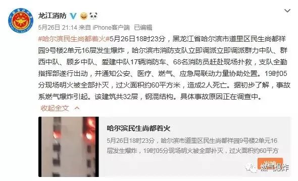 據(jù)@龍江消防:#哈爾濱民生尚都著火#5月26日18時(shí)23分,黑龍江省哈爾濱市道里區(qū)民生尚都祥園9號樓2單元16層發(fā)生爆炸,哈爾濱市消防支隊(duì)立即調(diào)派立即調(diào)派群力中隊(duì)、群西中隊(duì)、顧?quán)l(xiāng)中隊(duì)、愛建中隊(duì)17輛消防車、68名消防員趕赴現(xiàn)場撲救,支隊(duì)全勤指揮部遂行出動,并通知公安、醫(yī)療、燃?xì)?、?yīng)急局聯(lián)動力量協(xié)助處置。19時(shí)05分現(xiàn)場明火被全部撲滅,過火面積約60平方米,造成2人死亡。據(jù)初步了解,事故系燃?xì)獗ㄒ?。該建筑?2層,鋼混結(jié)構(gòu)。