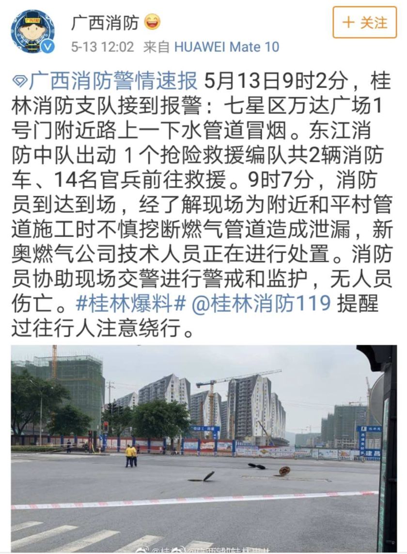 中午12時(shí),@廣西消防官微發(fā)布了一警情速報(bào):5月13日9時(shí)2分,桂林消防支隊(duì)接到報(bào)警:七星區(qū)萬達(dá)廣場1號(hào)門附近路上一下水管道冒煙。9時(shí)7分,消防員到達(dá)到場,經(jīng)了解現(xiàn)場為附近和平村管道施工時(shí)不慎挖斷燃?xì)夤艿涝斐尚孤?新奧燃?xì)夤炯夹g(shù)人員正在進(jìn)行處置。消防員協(xié)助現(xiàn)場交警進(jìn)行警戒和監(jiān)護(hù),無人員傷亡。