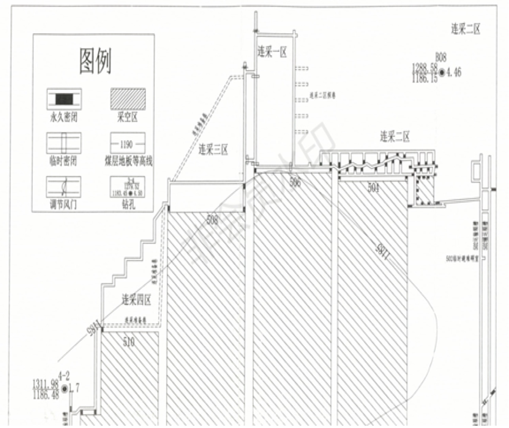 式回采。一區(qū)和二區(qū)的開采實(shí)為同一個(gè)工作面,在開采一區(qū)時(shí),同步開采二區(qū),即506連采工作面實(shí)為一區(qū)、二區(qū)合并而成。
