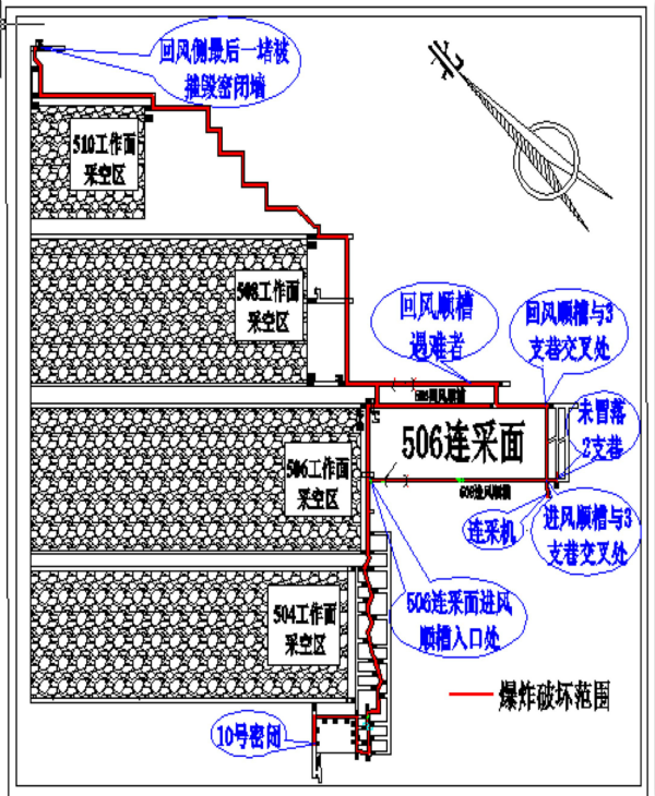1. 爆炸沖擊波及全礦井,主要破壞范圍為506連采面和506連采面進(jìn)、回風(fēng)巷道(如圖3)。
