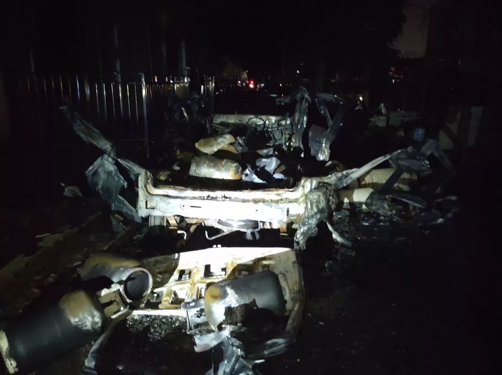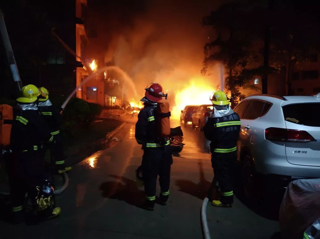 2時(shí)34分,中隊(duì)剛到場(chǎng),指揮員立即勘查現(xiàn)場(chǎng),小車已被大火吞噬,火災(zāi)已蔓延到附近的出租屋,有人員被困,聽(tīng)到有六七聲爆炸聲,并看到有氣瓶飛到河對(duì)面。