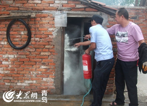 7月25日13時(shí),黃島公安分局理務(wù)關(guān)派出所接到群眾報(bào)警,村民曲大娘在廚房給老伴煮綠豆湯時(shí)煤氣罐突然起火。接警后,理務(wù)關(guān)派出所民警立即趕到現(xiàn)場(chǎng),發(fā)現(xiàn)煤氣罐在西屋廚房?jī)?nèi),煤氣罐軟管接口脫落,接口處正在噴火,并且已經(jīng)引燃了附近的桌子,十分危險(xiǎn)。民警迅速靠近火勢(shì)區(qū)域,頂著濃煙先將煤氣閥關(guān)閉,然后和附近群眾一起利用滅火器對(duì)廚房?jī)?nèi)可燃物進(jìn)行噴灑,并用打濕的衣物蓋在液化氣罐上對(duì)罐體進(jìn)行冷卻,成功化解了險(xiǎn)情。此時(shí),曲大娘懸著的心也放了下來。