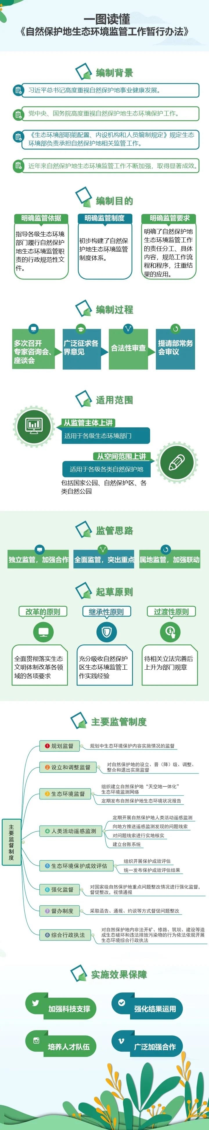 在這樣的背景下,生態(tài)環(huán)境部組織編制了《暫行辦法》,是深入貫徹習(xí)近平生態(tài)文明思想,有效落實黨中央國務(wù)院關(guān)于自然保護地事業(yè)改革各項重大部署,切實履行自然保護地生態(tài)環(huán)境監(jiān)管職責(zé)的重要舉措。其主要目的,一是明確監(jiān)管依據(jù) ,《暫行辦法》是指導(dǎo)各級生態(tài)環(huán)境部門履行自然保護地生態(tài)環(huán)境監(jiān)管職責(zé)的行政規(guī)范性文件;二是明確監(jiān)管制度,《暫行辦法》初步構(gòu)建了自然保護地生態(tài)環(huán)境監(jiān)管制度體系;三是明確監(jiān)管要求, 《暫行辦法》明確了自然保護地生態(tài)環(huán)境監(jiān)管工作的責(zé)任分工、具體內(nèi)容,規(guī)范工作流程和程序,注重結(jié)果的應(yīng)用。